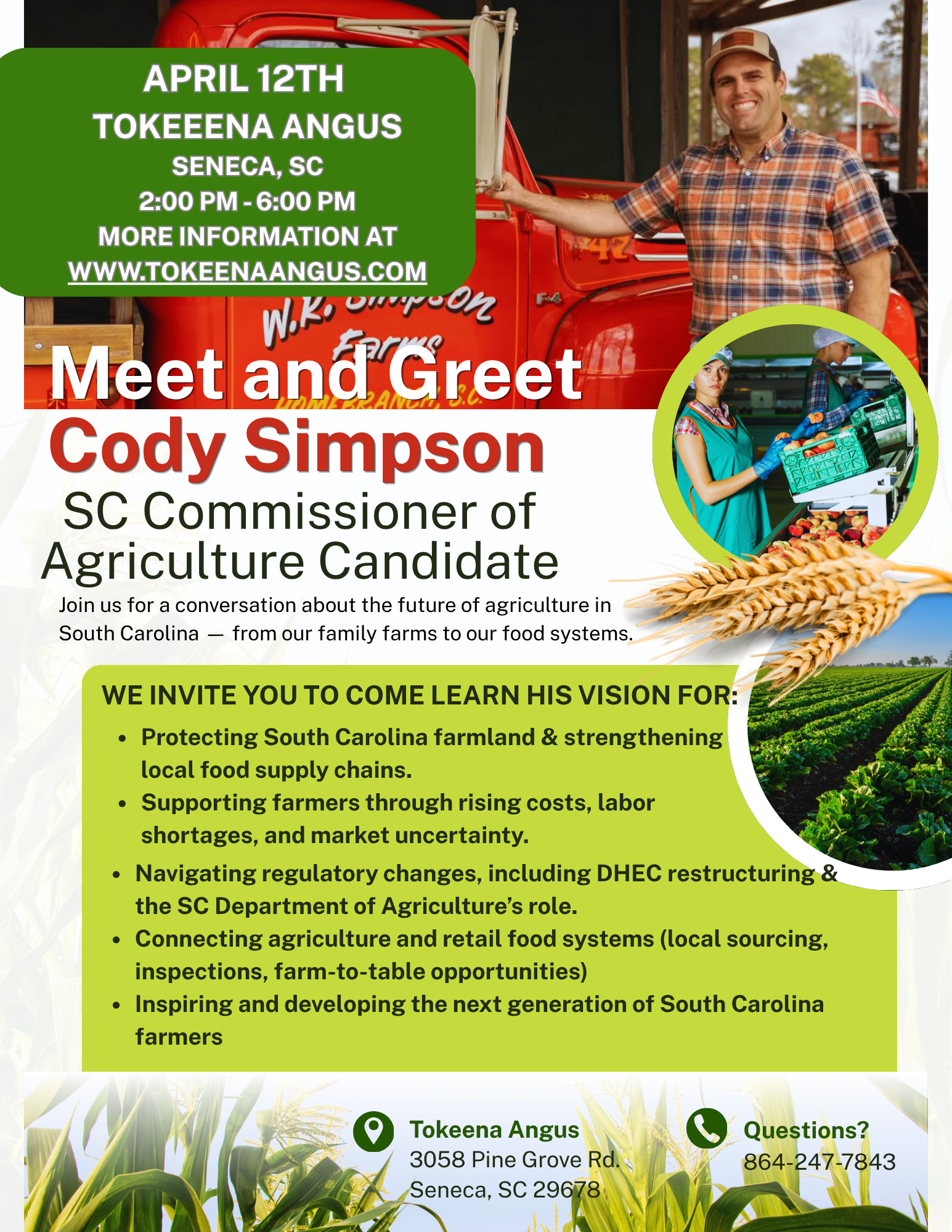 Cody Simpson is a fifth-generation South Carolina farmer from Clarendon County in the Pee Dee, with deep roots in production agriculture and a lifelong commitment to the land. He previously served as State Executive Director of the USDA Farm Service Agency and as an agriculture advisor to Governor Henry McMaster. Today, he is a candidate for South Carolina Commissioner of Agriculture.
